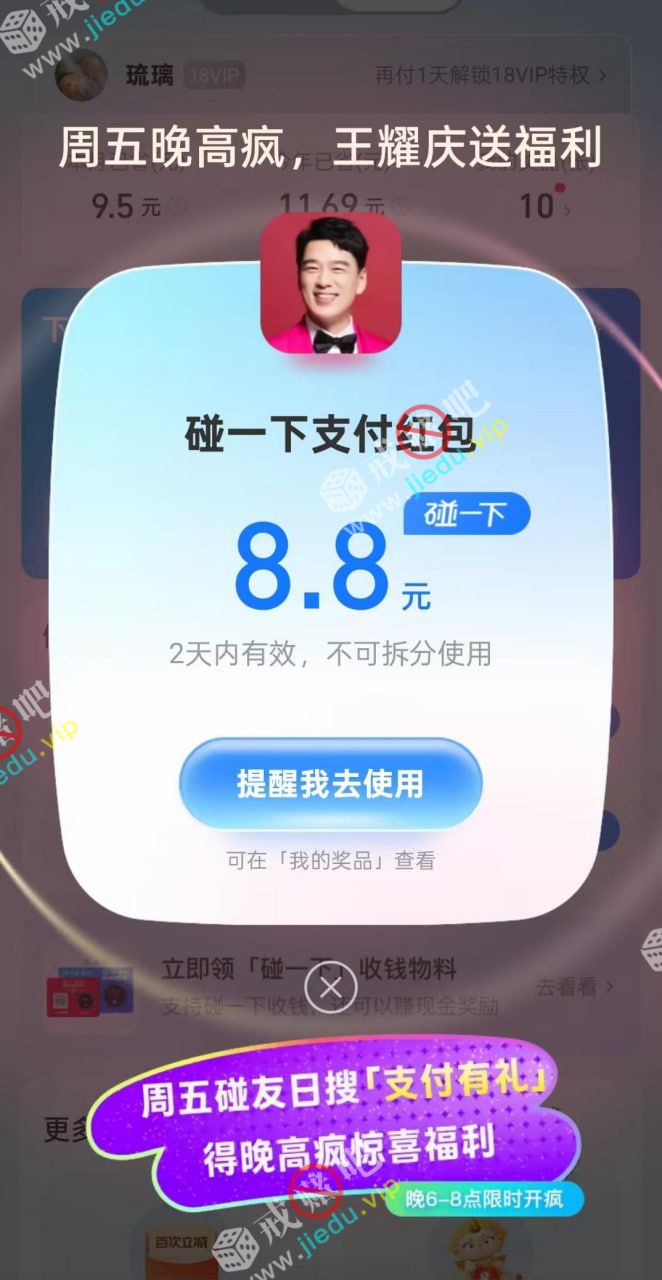 七点准时去搜 抢8.8碰一碰[红包]不要提早去哈,提前蹲好 8点还有一场!无门槛.