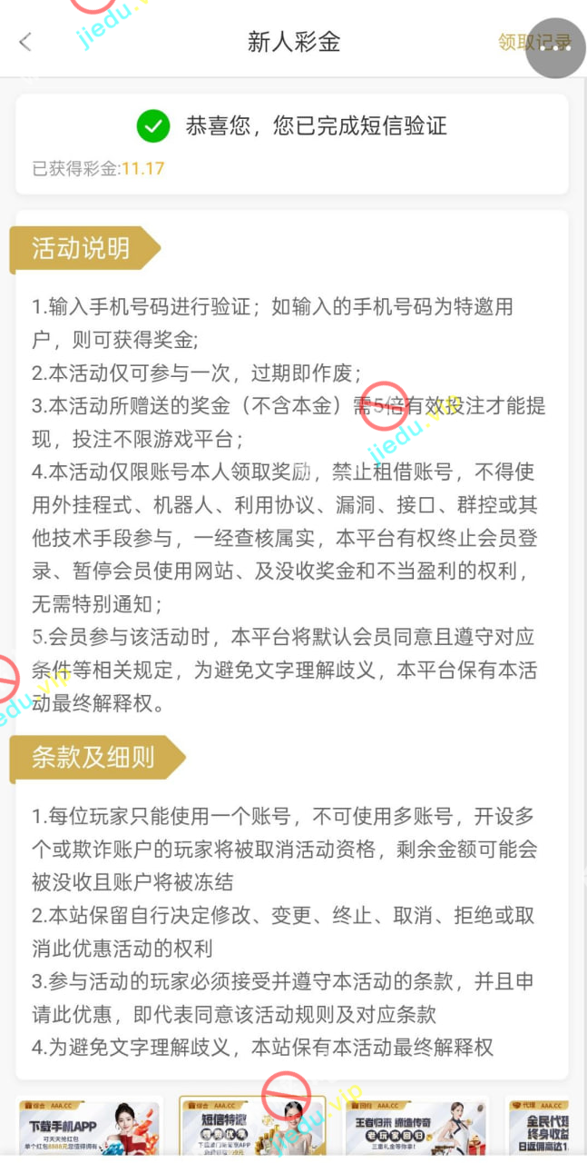刚才看到老哥发帖电话特邀碰瓷580元彩金,试着直接用手机号码注册账号,联系客服说号码不在特邀名单,进入优惠活动里面有个短信特邀认证领取9-999彩金,试着认证一下,意外的是通过了认证,获得彩金了,兄弟们可以试一下子 。